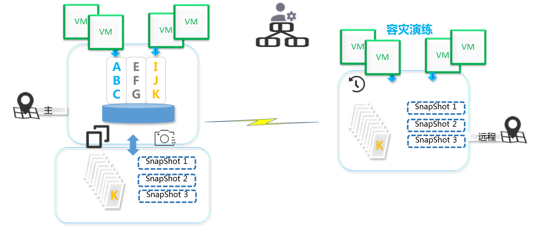 通過底層超融合存儲層直接通訊,通過在主備數據中心專線網絡,動態(tài)捕捉到主數據中心存儲要備份的存儲卷發(fā)生變化時備份集群存儲能夠響應的獲取數據變化,寫入存儲數據一致;同時還支持虛擬機定期備份快照保存,生成回滾時間鏈,快照數量不受限制。